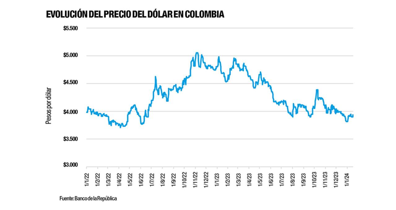 La llegada del Gobierno de Gustavo Petro, anuncios sobre la decisión de no entregar más contratos de exploración de petróleo y gas, y las reformas propuestas, a lo que se sumó la fortaleza del dólar en el mundo, hicieron que en noviembre de 2022 el precio de la divisa en el país superara la barrera de los 5.000 pesos. Pero tras tocar ese techo, el dólar ha venido corrigiendo su valor y en 2023 bajó casi 1.000 pesos, al cerrar el año en 3.822 pesos, después de haber comenzado en 4.810. “Los contrapesos institucionales moderaron los temores sobre la aprobación de las reformas económicas propuestas por el Gobierno de Gustavo Petro y contribuyeron a cerrar la mayor parte del castigo al peso colombiano que se abrió desde mediados de 2022. Las elecciones regionales del 29 de octubre ratificaron esta perspectiva”, dice un estudio de Corficolombiana.