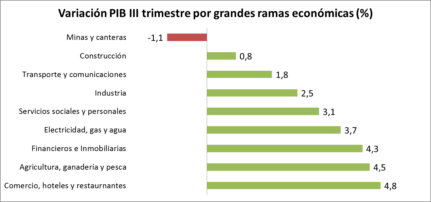 La única rama de la actividad económica que decreció lo debe especialmente a la reducción de la extracción de crudo y gas natural que termina 3 periodos de crecimiento. El carbón desacelera su caída y la extracción de minerales no metálicos continúa creciendo a un bien ritmo.