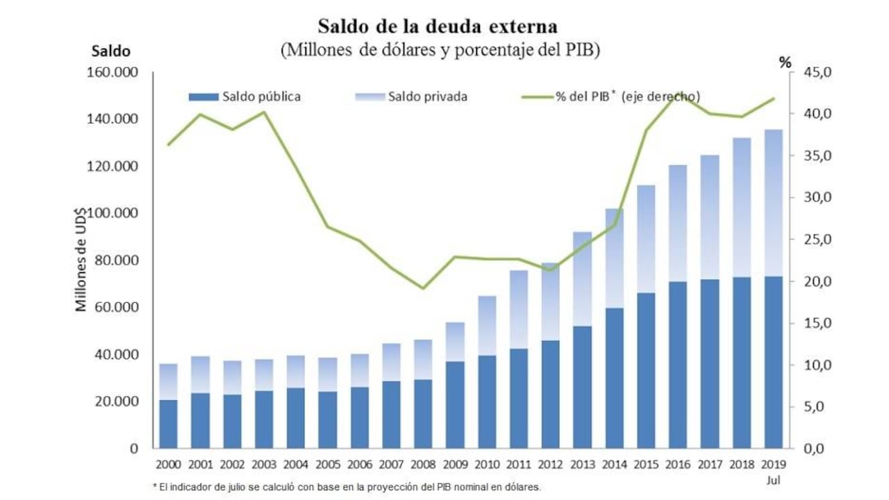 Por el lado público, la deuda pasó de US$72.999 millones en diciembre de 2018 a US$73.246 millones en julio pasado.