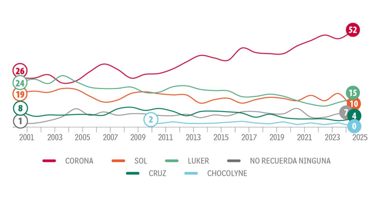 Por estratos, en los mayores ingresos (4, 5 y 6) recuerdan más a Corona con 53 por ciento, seguido por el estrato 3 con 52 por ciento. Por edades, es entre los de 25 y 34 años donde Corona fue más recordada con 56 por ciento, pero es entre los de 35 y 49, así como en los de 50 y más, donde gana 10 puntos frente a 2023. La marca más innovadora es Corona con 48 por ciento, igual porcentaje que en 2023. Luker ganó 10 puntos y llegó a 22 por ciento. Sol perdió 4 puntos y quedó en 8 por ciento. En confianza, Corona ganó 3 puntos frente a 2023 y obtuvo 51 por ciento. Luker ganó 3 puntos y quedó con 17 por ciento.