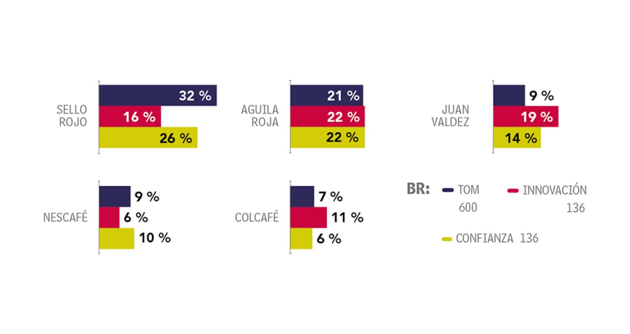 Sello Rojo sigue creciendo en el top of mind. Con un punto más, mantuvo el liderazgo entre los cafés molidos, al obtener 32 por ciento, seguido por Águila Roja con 21 por ciento y Nescafé con 9 por ciento. A la hora de pensar en el café, los barranquilleros se inclinan por la líder de esta categoría con 42 por ciento, aunque pierde en esta ciudad 13 puntos.