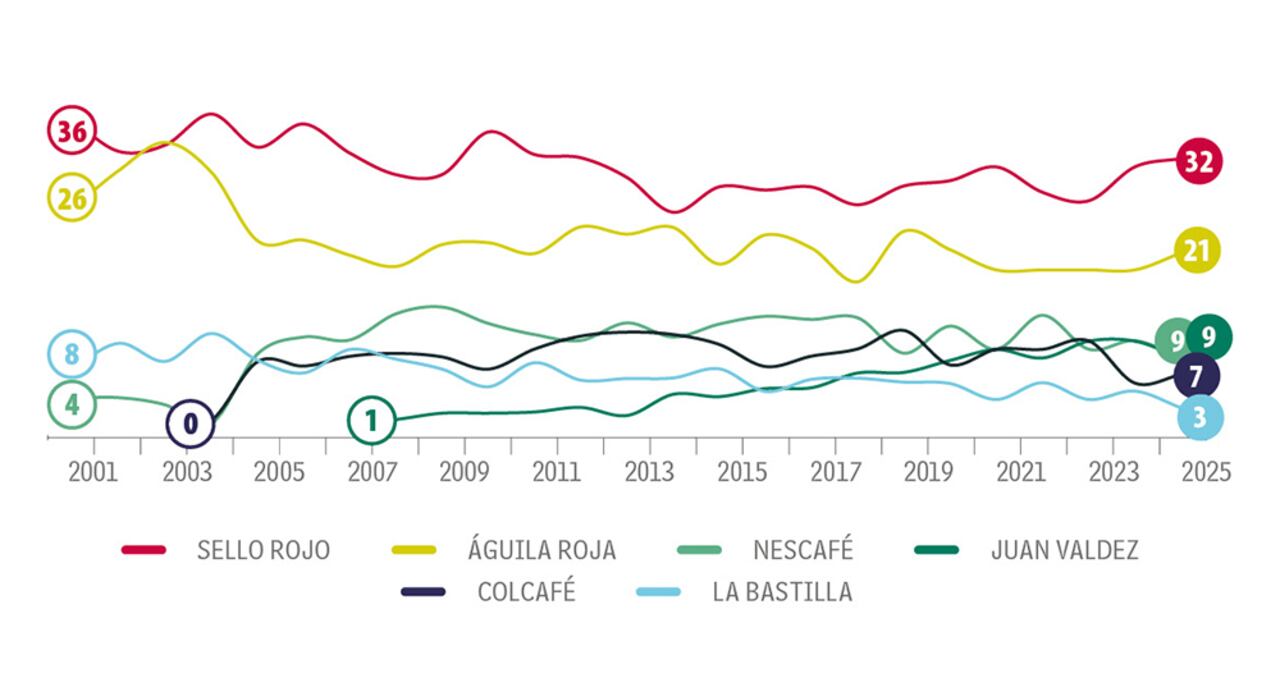 En Cali, Águila Roja obtiene 31 por ciento, y la mayor calificación para Nescafé se la dan en Medellín con 16 por ciento. Este año, las mujeres recordaron más a Sello Rojo que en 2024 con 35 por ciento, 8 puntos adicionales; frente a los hombres, el top of mind de la marca cayó 7 puntos. En el estrato 3, Sello Rojo registra 34 por ciento y 8 puntos más, mientras que Águila Roja es más recordada en el estrato 2 con 25 por ciento. Por edades, son los de 50 años o más los que tienen con mayor presencia en la mente a Sello Rojo con 37 por ciento. Dentro de las más innovadoras, Águila Roja obtuvo 22 por ciento, 7 puntos más que en 2023, mientras que en el segundo lugar se ubicó Juan Valdez con 19 por ciento, aunque cayó 7 puntos. Y la marca en la que más confían los consultados es Sello Rojo con 26 por ciento, 6 puntos más que en 2023, seguida por Águila Roja con 22 por ciento.