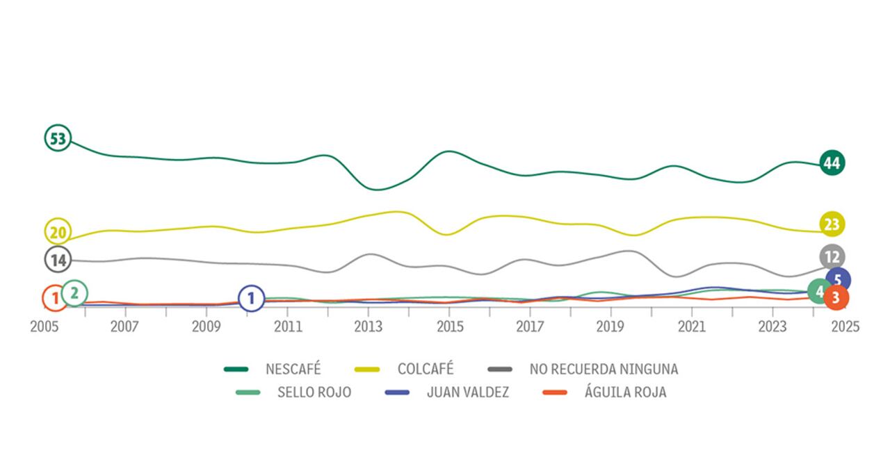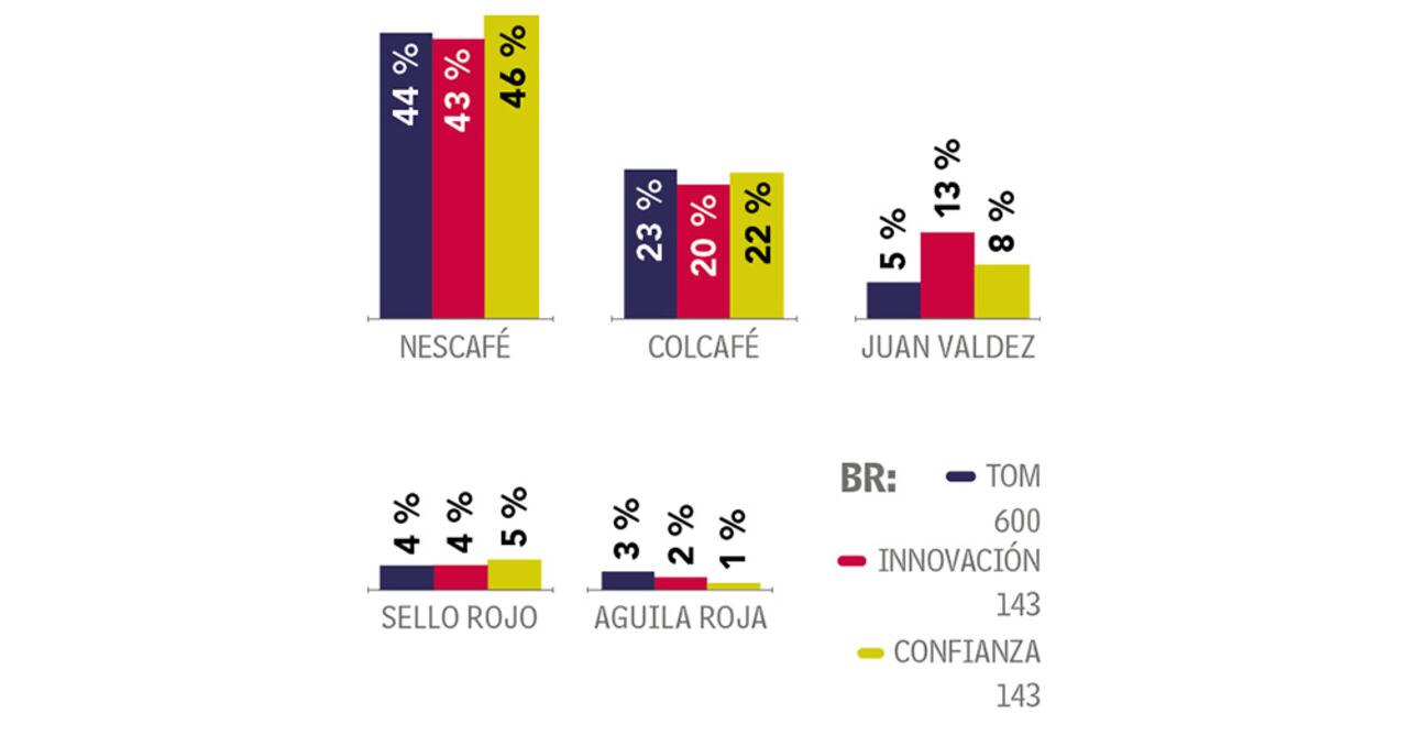 A Colcafé lo recordaron esta vez más en Barranquilla con 27 por ciento, aunque perdió 9 puntos frente a 2024. Son las mujeres las que más recuerdan a Nescafé con 45 por ciento, mientras los hombres pierden 2 puntos en comparación al año pasado y quedan con 41 por ciento. La marca más innovadora en esta categoría este año sigue siendo Nescafé con 43 por ciento, con 10 puntos más frente a 2023, le sigue Colcafé con 20 por ciento y 9 puntos menos, y luego se ubica Juan Valdez, con 13 por ciento. La marca en la que más confían los encuestados es Nescafé con 46 por ciento, 7 puntos más frente a 2023, y en un segundo lugar Colcafé, al registrar 22 por ciento.
