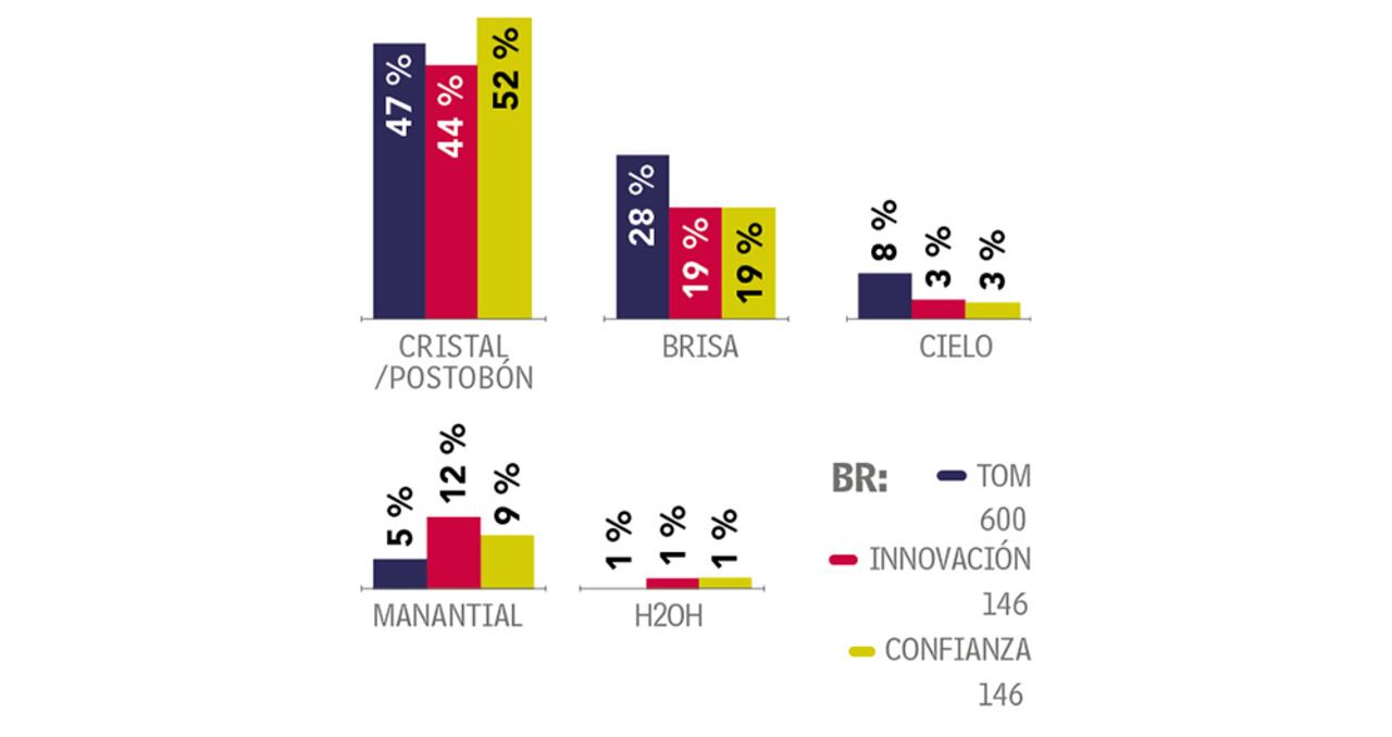 Cristal, de Postobón, continúa este año, con el mayor top of mind de esta categoría y mantiene el mismo puntaje del año pasado con 47 por ciento, seguida por Brisa, con 28 por ciento, y por Cielo, con 8 por ciento y 2 puntos más frente a 2024. Es en Barranquilla donde más recuerdan a la líder con 56 por ciento, 13 puntos más que el año pasado; Brisa gana en Medellín con 36 por ciento, y Cielo alcanza, en Bogotá y Cali, 9 por ciento, respectivamente.