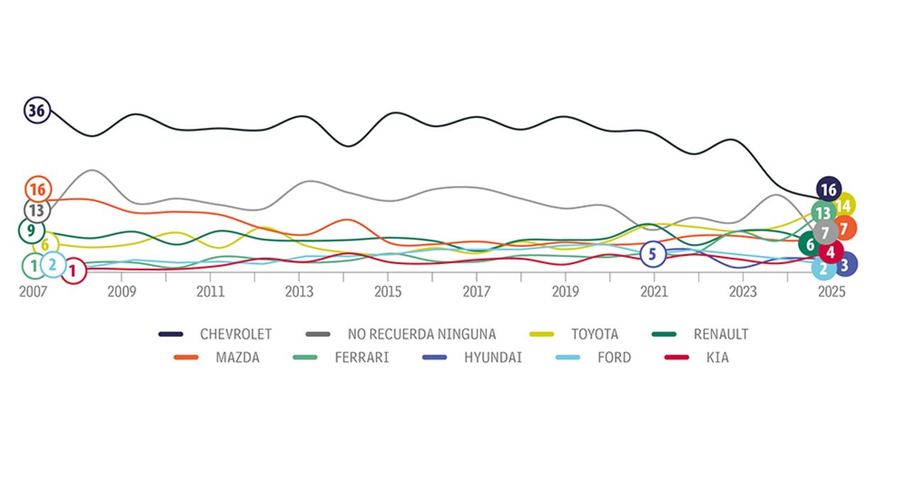 La líder en el top of mind en esta categoría, Chevrolet, cae en recordación de 19 a 16 por ciento. La gran carrera la ha dado este año Toyota al pasar del 10 al 14 por ciento, en un avance que la acerca a la líder de los automóviles. Ferrari sube 6 puntos y llega a doble dígito al alcanzar 13 por ciento. El ‘no recuerda’ cae 10 puntos y queda en 7 por ciento, la misma puntuación obtenida por Mazda. En Bogotá, Chevrolet es más recordada, con 23 por ciento. En los varones, Chevrolet alcanza 17 por ciento, mientras que en las chicas pasa de 20 a 16 por ciento. En el estrato 2 recuerdan más a Chevrolet, con 18 por ciento. En el estrato 3 registra una recordación de 17 por ciento y una caída de 8 puntos, y en los estratos 4, 5 y 6 alcanza 10 por ciento. Por edades, Chevrolet obtiene 25 por ciento entre los chicos de 15 a 17 años.