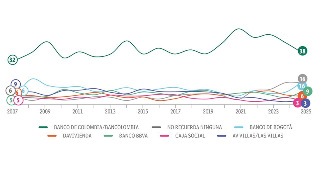 Bancolombia es el de mayor top of mind, con 38 por ciento, aunque pierde 7 puntos frente al año pasado. El ‘no recuerda’ registra 16 por ciento, mismo porcentaje para el Banco de Bogotá, que gana 7 puntos. En Bogotá, Bancolombia es más recordada, con 45 por ciento; en Medellín su nivel de recordación cae 10 puntos y se ubica en 43 por ciento; en Cali, la reducción es de 12 puntos al llegar a 25 por ciento. Los niños y adolescentes son los que más tienen presente a Bancolombia, con 41 por ciento, género en el que gana 4 puntos. En el estrato 2 recuerdan a Bancolombia con 41 por ciento, en el estrato 3 alcanza 40 por ciento y en los estratos 4, 5 y 6 pasa de 35 a 26 por ciento.