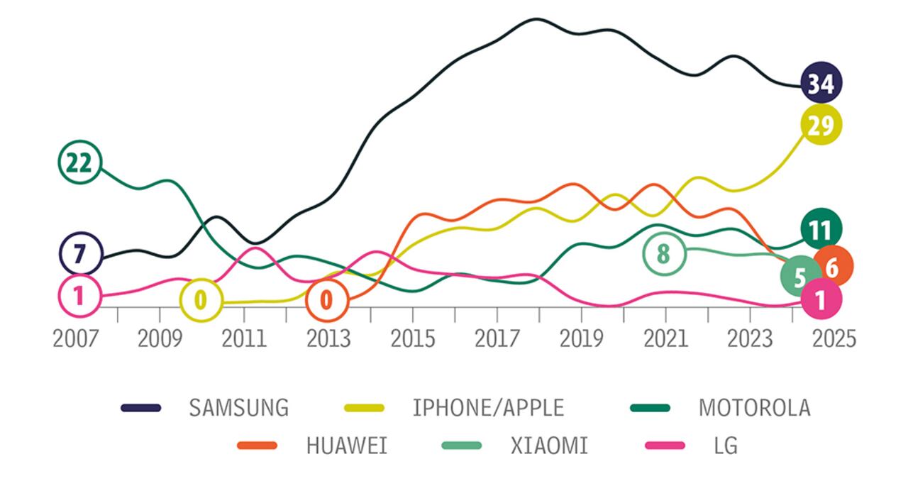 Samsung sigue liderando este top of mind con 34 por ciento y frente a 2024 pierde un punto, en una tendencia al descenso que se marcó en 2023 cuando había alcanzado 39 por ciento. iPhone sube 8 puntos y sigue su ascenso, que este año la lleva a alcanzar 29 por ciento de recordación, su mayor indicador en la medición. Motorola, en tercer lugar, sube 2 puntos y alcanza 11 por ciento; Huawei es recordada con 6 por ciento, 2 puntos menos frente al año pasado, y Xiaomi, con 5 por ciento, cae 3 puntos en esta medición. Por ciudades, en Barranquilla recordaron más a Samsung, con 45 por ciento, y allí ganó 4 puntos frente al año pasado. En Bogotá esta marca es recordada con 36 por ciento y un punto más frente a 2024; en Medellín, con 30 por ciento, pierde 7 puntos, y en Cali la puntuación es de 24 por ciento y 9 puntos menos. Por su parte, a iPhone le va mejor en Bogotá, con 31 por ciento y 13 puntos más. Los chicos, con 36 por ciento, son los que más tienen en mente a Samsung, marca a la que le dan 3 puntos más frente al año pasado, y en menor proporción las mujeres, que le dan 31 por ciento en recordación, 7 puntos menos que en 2024. Por nivel socioeconómico, en los estratos 4, 5 y 6 tienen más presente en la mente a Samsung, con 38 por ciento, aunque pierde 5 puntos; le sigue el estrato 2, en el que recuerdan a la marca con 34 por ciento y un punto menos, y en el estrato 3, con 31 por ciento, baja 2 puntos.