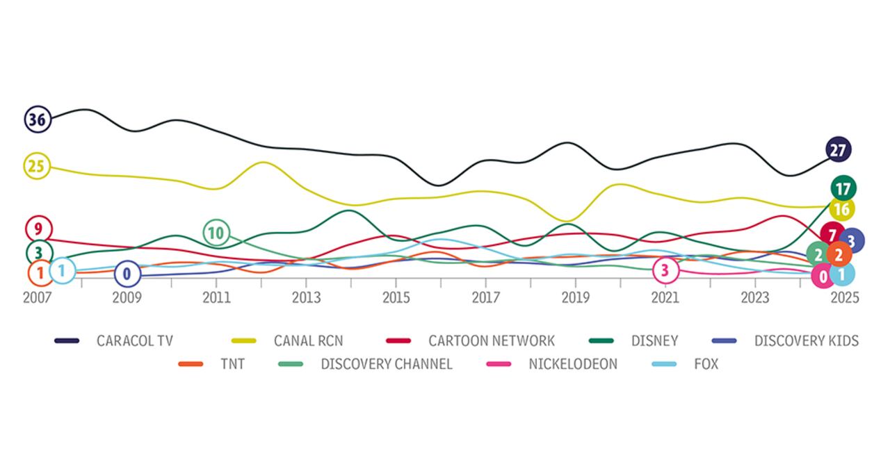 Caracol sigue liderando el top of mind con 27 por ciento y gana 4 puntos frente a 2024. El Canal RCN se mantiene con 16 por ciento, pero Disney llega al segundo lugar, al subir de 7 a 17 por ciento. Cartoon Network registra 7 por ciento, aunque pierde 7 puntos frente al año pasado. Por ciudades, Caracol obtiene 34 por ciento en Bogotá y suma 9 puntos; en Medellín alcanza 23 por ciento y 2 puntos menos; en Cali, este canal gana 15 puntos al alcanzar 24 por ciento, y en Barranquilla cae 32 puntos y se ubica con 4 por ciento. Por género, los varones son los que más recuerdan a Caracol, con 30 por ciento, y gana entre ellos 14 puntos, mientras que en las niñas y adolescentes obtiene 24 por ciento de recordación y cae 5 puntos frente al año pasado. En el nivel socioeconómico 2, Caracol registra 33 por ciento y 5 puntos más; en el estrato 3, 23 por ciento y 3 puntos más, y en los estratos 4, 5 y 6, 22 por ciento y 5 puntos más. Por edades, Caracol, en los de 15 a 17 años, llega a 30 por ciento. En el grupo de 11 a 14 años, el Canal RCN obtiene 18 por ciento, y Disney, 20 por ciento. Entre los de 8 a 10 años, Cartoon Network tiene 16 por ciento.