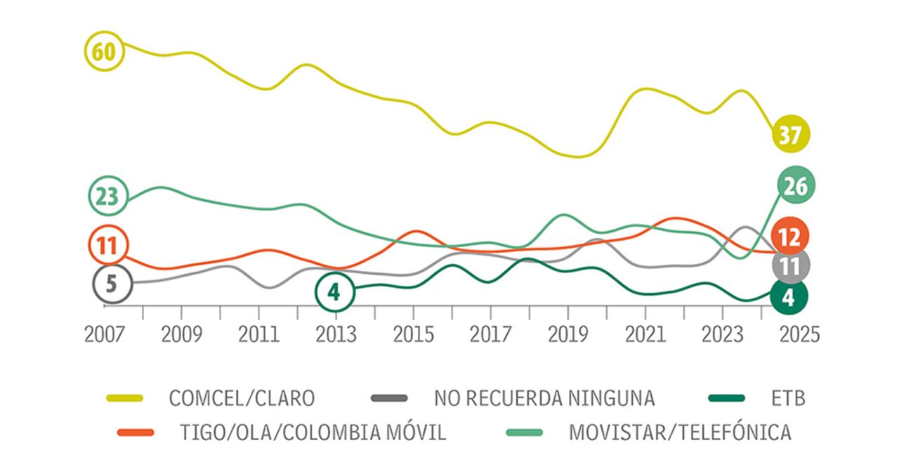 Claro sigue como líder en este top of mind con 37 por ciento. Sin embargo, pierde 12 puntos porcentuales frente al año pasado, un espacio aprovechado por Movistar, que salta a 26 por ciento, con 15 puntos más frente a 2024. Siguen Tigo, con 12 por ciento, el ‘no recuerda’, con 11 por ciento, y Wom, con 5 por ciento. ETB gana 3 puntos y llega al 4 por ciento. En Bogotá, Claro logra su mayor registro, con 50 por ciento y un punto menos frente a 2024. Entre los niños y adolescentes se recuerda más a Claro, con 46 por ciento. A Claro la recuerdan más en el estrato 3, con 42 por ciento, en el 2 llega a 37 por ciento, pero con 16 puntos menos, y en los estratos 4, 5 y 6, con 30 por ciento en recordación, se registra su mayor caída: 26 puntos. Por edades, los de 8 a 10 años son los que tienen más presente en sus mentes a Claro, con 43 por ciento, y ahí gana 5 puntos.