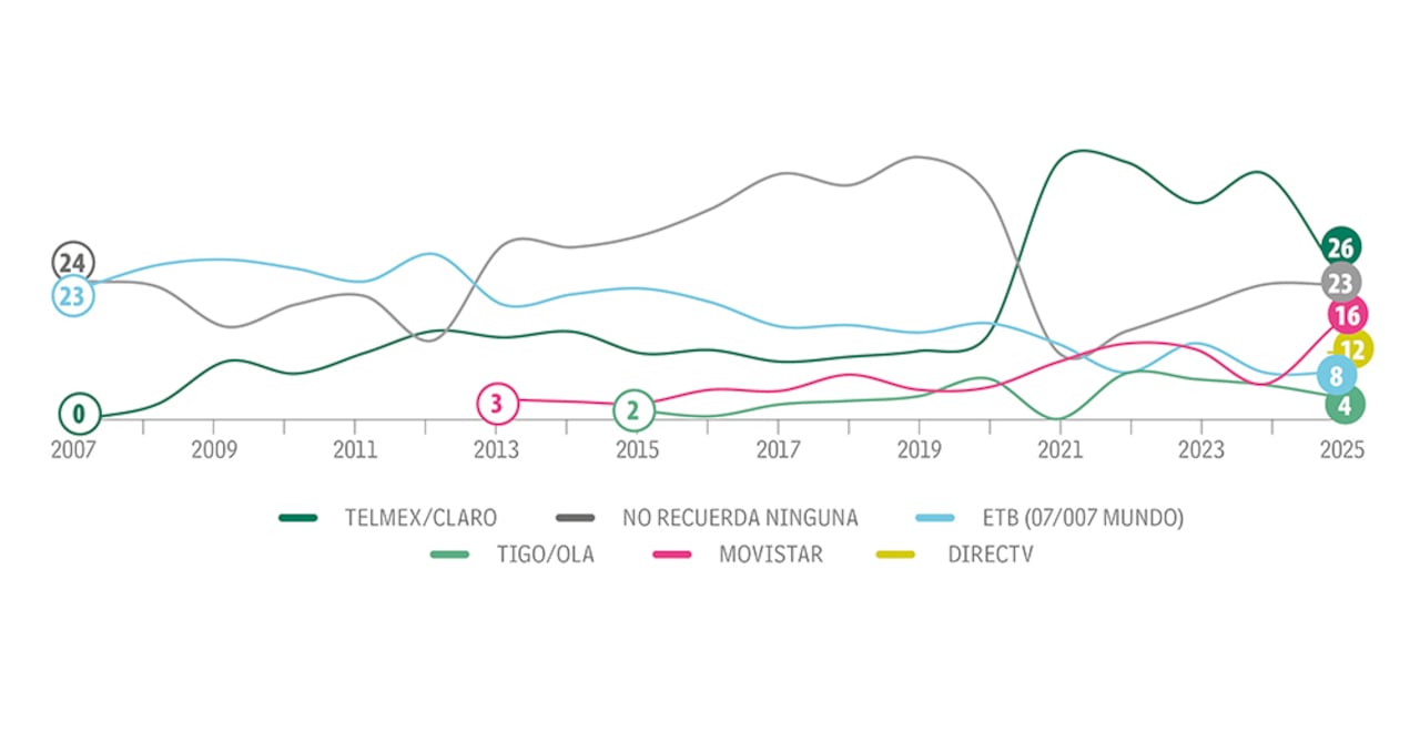 En esta categoría, que se refiere a las compañías prestadoras de servicios de telefonía fija, televisión o internet, Claro sigue liderando el top of mind. En esta oportunidad alcanzó 26 por ciento de recordación, aunque perdió 16 puntos entre niños y jóvenes. El ‘no recuerda’ se mantiene con 23 por ciento, y Movistar aparece con 16 por ciento y gana 10 puntos frente a 2024, recuperándose así de una caída de 6 puntos. Directv también gana terreno en esta medición al subir 5 puntos y obtener 12 por ciento; ETB se mantiene en 8 por ciento y Tigo pierde 2 puntos al llegar a 4 por ciento. En Bogotá recuerdan más a Claro, pero también pierde 9 puntos. Los niños y adolescentes son los que más recuerdan a Claro, con 27 por ciento. En el nivel socioeconómico 2, esta marca logra 29 por ciento de recordación, y en el estrato 3 llega a 26 por ciento.