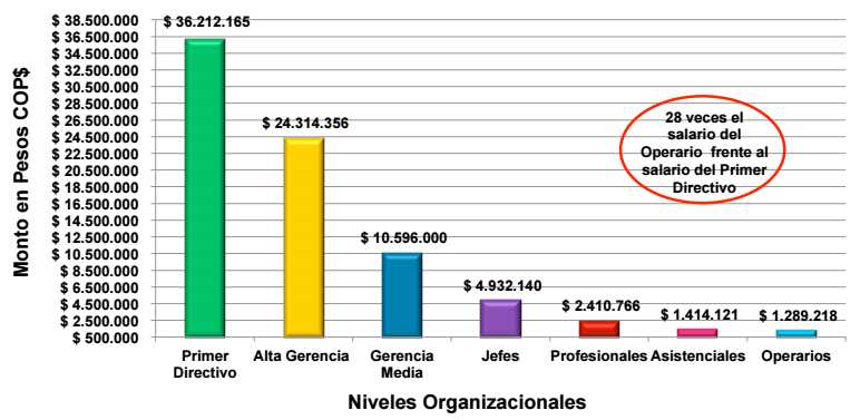 Según los niveles organizacionales, el salario de un primer directivo es 28 veces el salario de un operario, en promedio; así lo señaló el último Estudio de Compensación Total de Legis y Human Factor Consulting, que analizó 22 sectores de la economía, 620 cargos y 354 empresas de seis diferentes regiones del país.