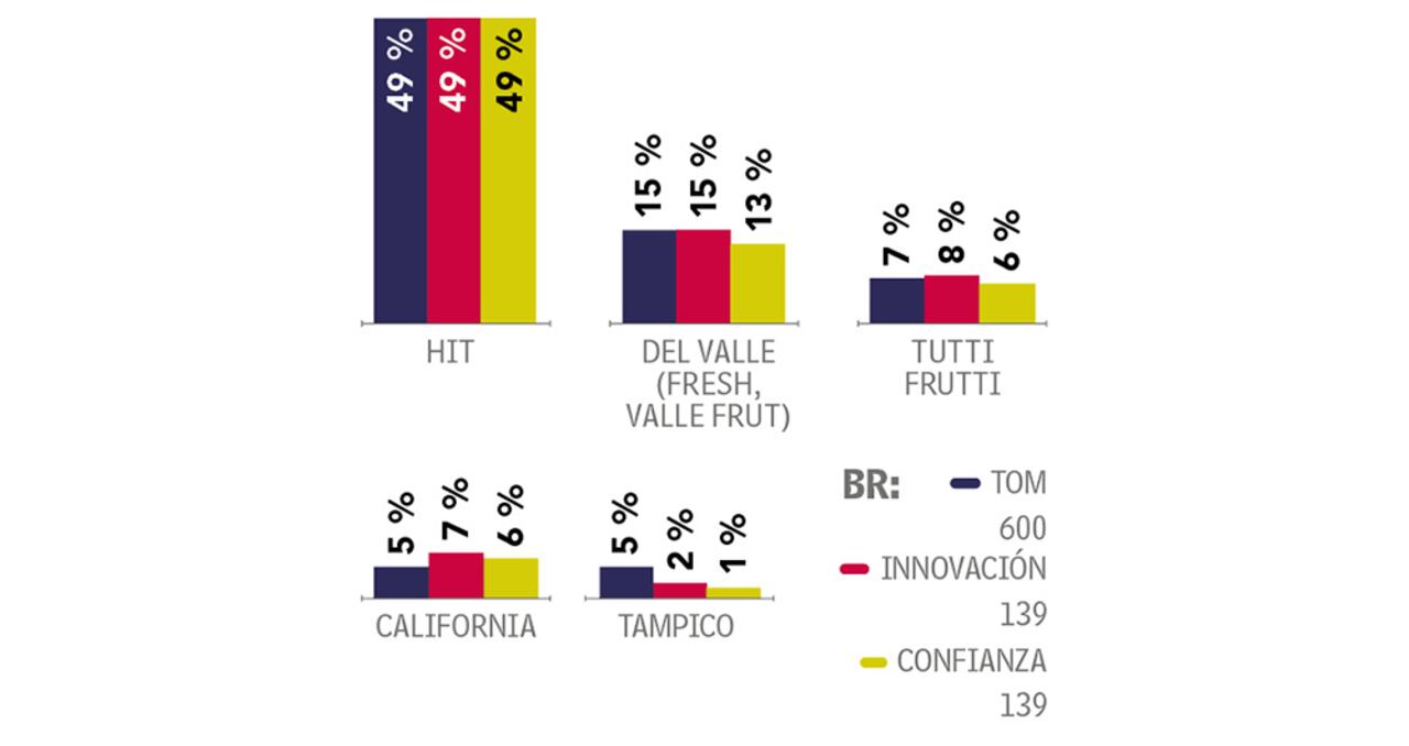 Con 2 puntos más frente a 2024, Hit sigue liderando el top of mind en esta categoría, con 49 por ciento. Le siguen Del Valle, con 15 por ciento, y Tutti Frutti, con 7 por ciento.