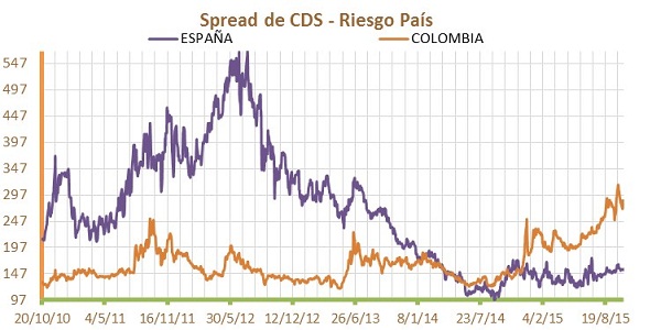 Comúnmente los derivados de crédito reflejan la percepción de riesgo. En el caso de los “Crediti Default Swaps” (CDS) un inversionista que adquiere un bono soberano puede cubrirse de un eventual impago renunciando a una parte de la rentabilidad del mismo. España tras la crisis tuvo un mayor riesgo país que Colombia, pero los mercados indican que desde finales del 2014 Colombia es más riesgoso que España.