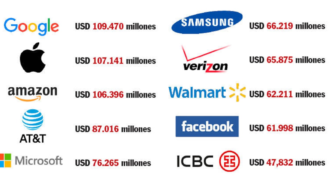 Google, el gigante de internet, se consolidó como la marca más valiosa del planeta al desplazar a Apple, según la última edición del listado 2017 de Brand Finance, firma británica especializada en valoración y estrategia de marca. Google quedó con un valor de 109.470 millones de dólares, 24 por ciento más que el año pasado y más de 2.000 millones por encima de Apple, que descendió 27 por ciento. Para medir el valor de una marca Brand Finance tiene en cuenta una serie de factores como el nivel de familiaridad, la lealtad, la promoción, la inversión en marketing, la satisfacción del personal y la reputación corporativa, entre otros. Ocupan los primeros lugares del podio compañías tecnológicas que siguen creciendo y ganando nuevos consumidores y que por lo pronto se mantienen indestronables. Facebook escaló varios puestos con un incremento del 82 por ciento frente al año pasado. Pero en el ranking también se metieron gigantes de otros sectores que mantienen dinamismo en ventas y fidelidad de clientes. Ese es el caso de la cadena estadounidense de almacenes Walmart y del banco chino ICBC. Otras compañías destacadas, aunque no en el top diez, son Toyota, McDonald’s, General Electric, Alibaba y Walt Disney.