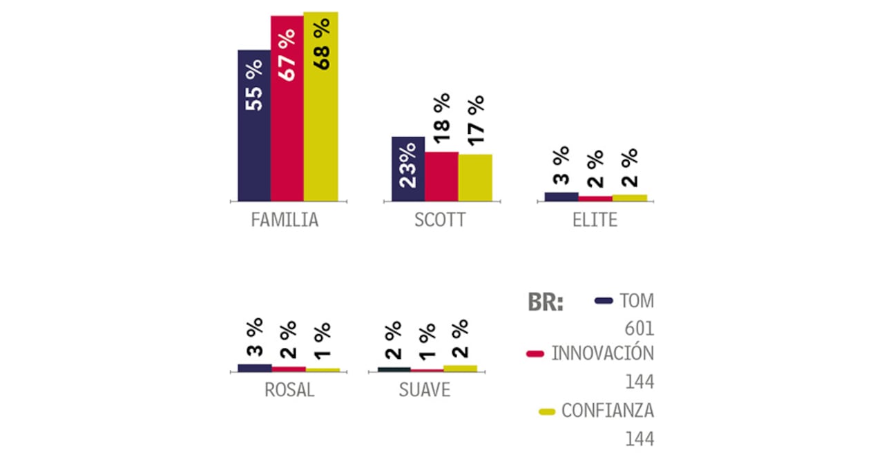 La marca más innovadora sigue siendo Familia con 67 por ciento, el mismo resultado de 2023. Scott en segundo lugar, alcanza con un punto más 18 por ciento. Y en confianza, Familia se mantiene, al pasar de 65 por ciento en 2023 a 68 por ciento en 2025, Scott baja 3 puntos, al alcanzar 17 por ciento, y Elite se mantiene en 2 por ciento.