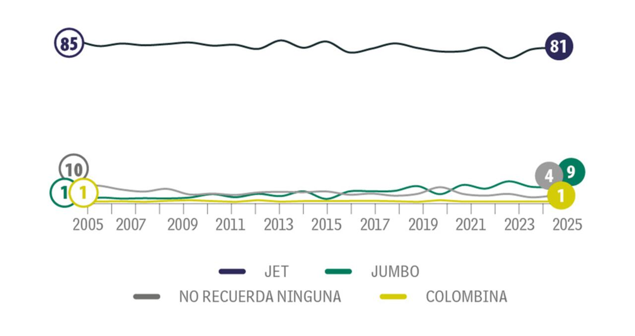 Es en Bogotá donde más recuerdan a Jet con 83 por ciento, 2 puntos más frente a 2024, le sigue Medellín donde obtiene un nivel de recordación de 82 por ciento y 2 puntos menos, en Cali llega a 79 por ciento y 4 puntos más, y en Barranquilla logra 74 por ciento con un punto menos.