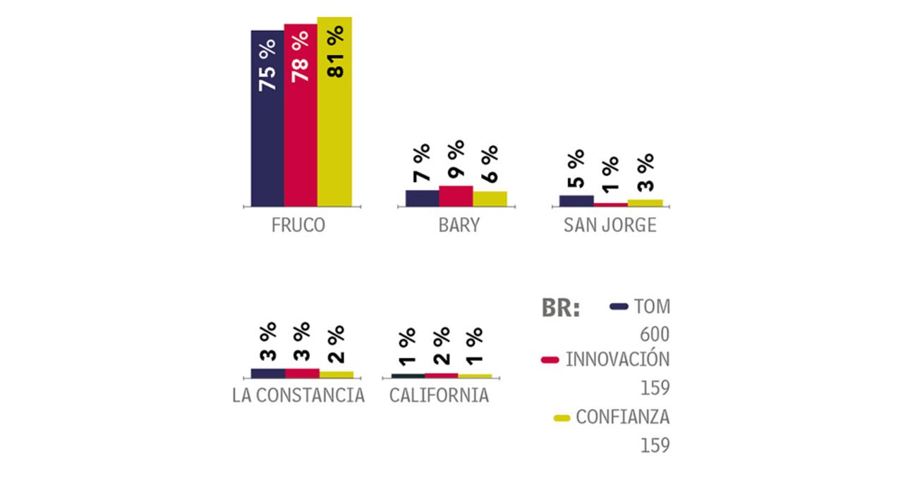 Entre las más innovadoras en esta categoría, lidera Fruco con 78 por ciento, y gana 7 puntos frente a 2023. Le sigue Bary con 9 por ciento, y La Constancia con 3 por ciento. En confianza, Fruco gana 3 puntos y suma 81 por ciento, seguida por Bary con 6 por ciento y San Jorge con 3 por ciento.