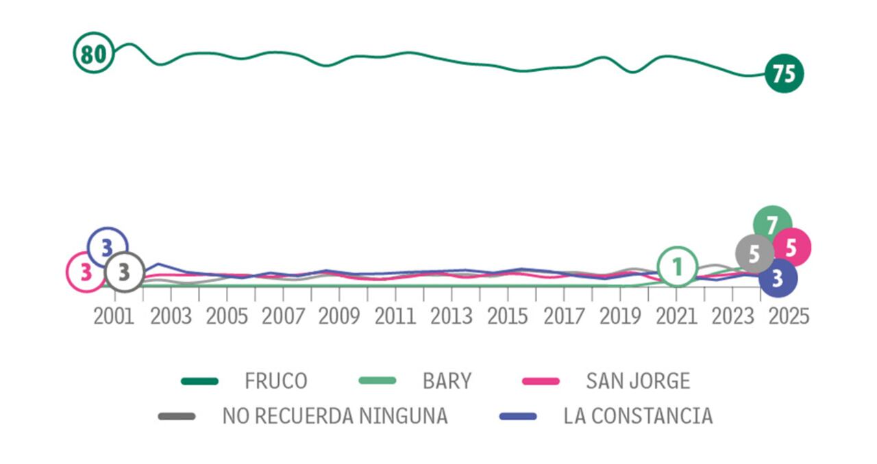 Fruco sigue siendo la marca inolvidable en esta categoría, en donde se mantiene con 75 por ciento de recordación, Bary, con 7 por ciento, continúa en segundo lugar, seguida por San Jorge con 5 por ciento, todas con el mismo puntaje del año pasado.