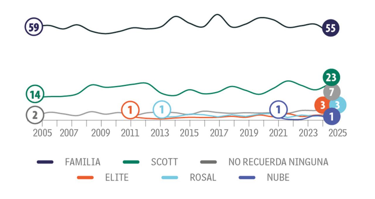 De nuevo Familia se lleva la recordación más alta en esta categoría con 55 por ciento, pero con 6 puntos menos frente a 2024, a diferencia de Scott que gana 4 puntos y sube a 23 por ciento. Gracias a ello, Scott se consolida en el segundo lugar y alcanza uno de sus mejores indicadores a lo largo de la medición.