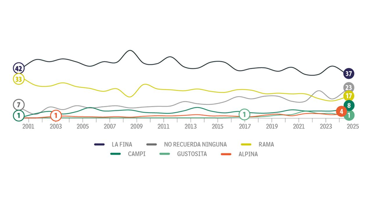 La Fina sigue siendo la más recordada entre las margarinas, esta vez, con 37 por ciento, aunque perdió 6 puntos frente a la medición de 2024; el ‘no recuerda’ gana un espacio de 7 puntos, y alcanza 23 por ciento. Rama, en tercer lugar, gana tres puntos y Campi obtiene dos puntos más en su cuarto lugar con 8 por ciento.
