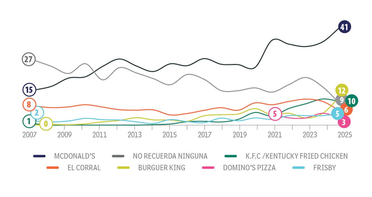 McDonald’s sigue dando grandes mordidas en este top of mind, que de nuevo lidera, esta vez con 41 por ciento y 5 puntos más, frente a 2024. El ‘no recuerda’ viene en descenso y este año llega a 9 por ciento, con 7 puntos menos frente a 2024.