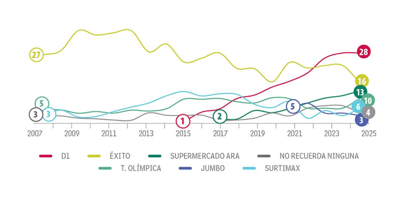 D1, la cadena de tiendas de bajo costo, viene desde 2023 encabezando esta categoría. Esta vez, con 28 por ciento, el mismo puntaje obtenido el año pasado. Éxito, la tradicional cadena de supermercados colombiana, ocupa el segundo lugar, con 16 por ciento, y 7 puntos menos frente al año pasado, una caída que hace parte de la tendencia a la baja en esta medición, que empezó en 2021.