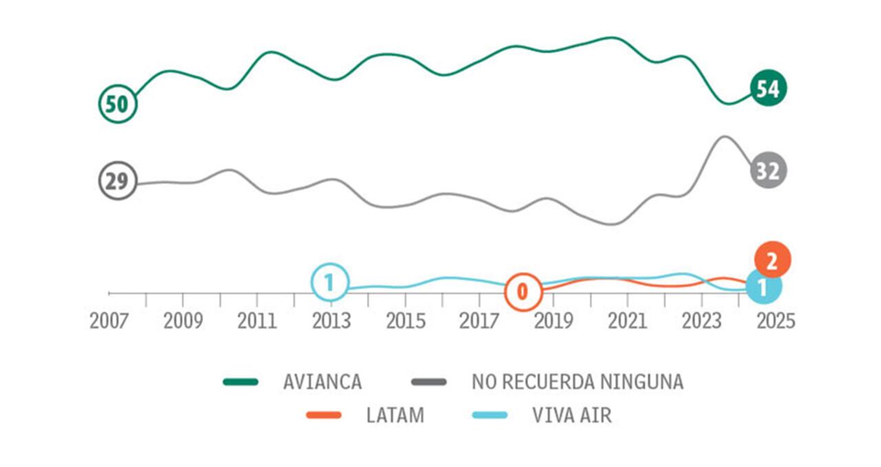 Viva Air Colombia y Wingo, empatan con 1 por ciento, la misma puntuación del año pasado. Es en Bogotá donde Avianca es más recordada, con 66 por ciento, y 10 puntos más frente a 2024; Medellín y Cali coinciden en recordación, con 49 por ciento, y en Barranquilla cae de 53 a 17 por ciento.
