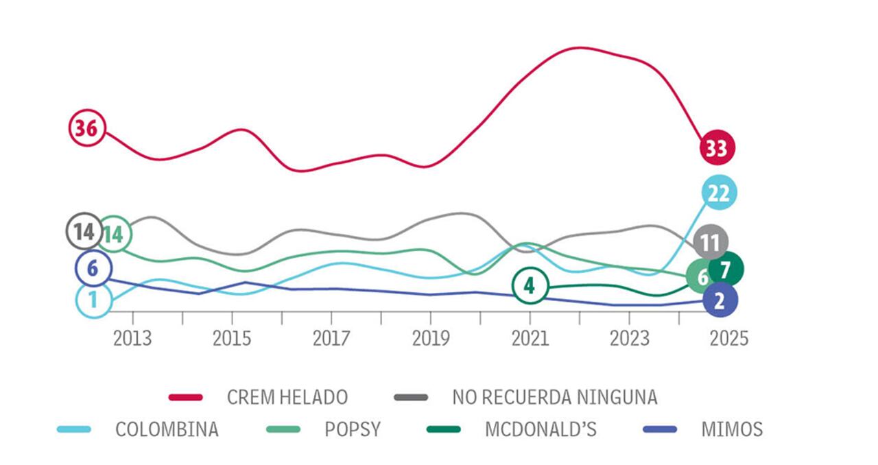El ‘no recuerda’ cae 6 puntos y llega al 11 por ciento. McDonald’s pasa de 3 a 7 por ciento, mientras que Popsy cae de 8 a 6 por ciento. En Bogotá y Medellín recuerdan más a Crem Helado, con 37 por ciento; mientras en la capital del país cae 14 puntos, en la antioqueña baja 13 puntos frente a 2024.