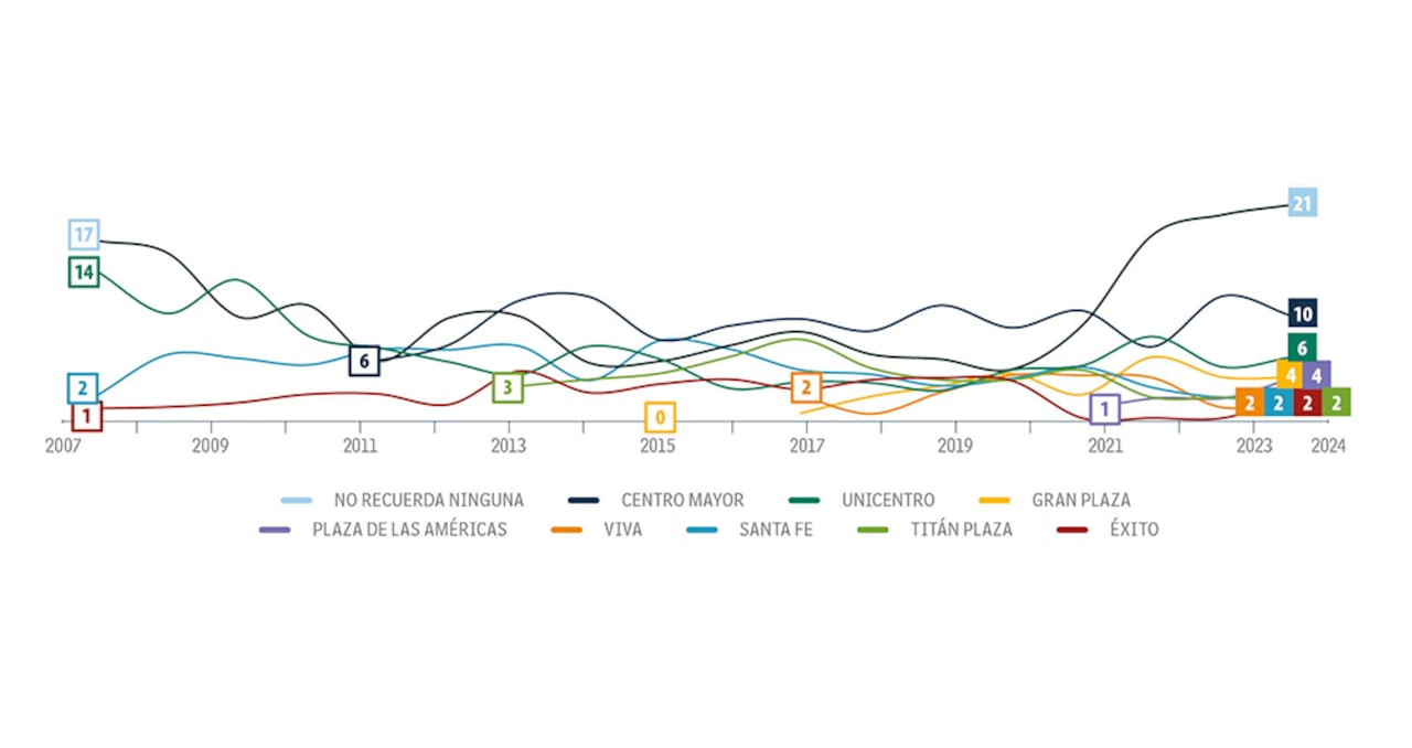 Centro Mayor registra 10 por ciento y 2 puntos menos, pese a que se había recuperado en 5 puntos entre 2022 y 2023. Unicentro gana un punto y llega al 6 por ciento. Les sigue Gran Plaza, con 4 por ciento.