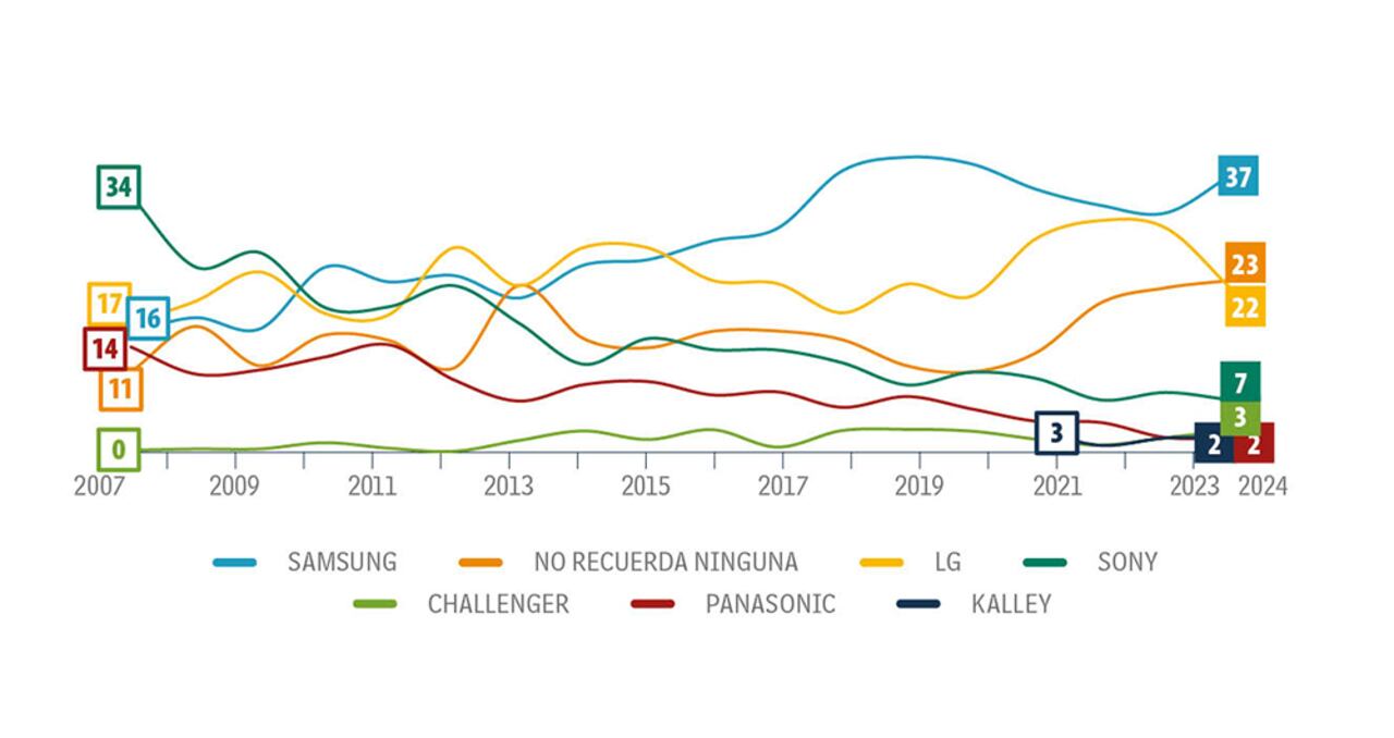 Lidera Samsung, con 37 por ciento y 5 puntos porcentuales más frente a 2023. La gran caída la da LG, que pasa de 30 a 22 por ciento. El ‘no recuerda’ marca este año 23 por ciento, un punto más que el año pasado. Sony, con un punto menos frente a 2023, registra una recordación de 7 por ciento.