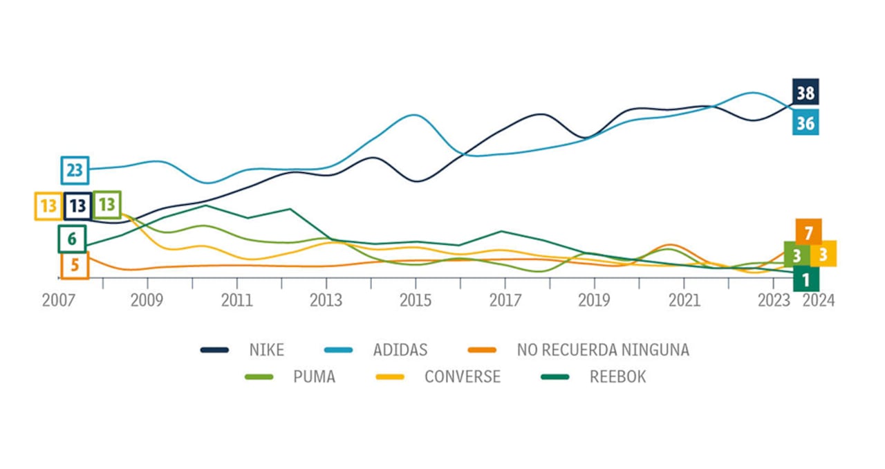 Nike y Adidas llevan más de cinco años peleando el primer y segundo puesto en el top of mind de esta categoría. En esta ocasión, con 4 puntos más, Nike, con 38 por ciento de recordación, desplaza a Adidas que pasó de 40 a 36 por ciento.