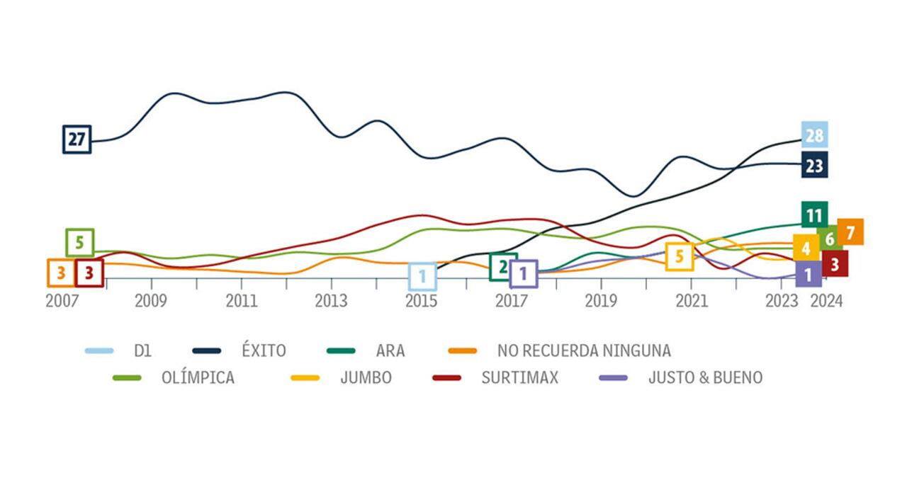 D1 gana 2 puntos porcentuales y queda en 28 por ciento de recordación, mientras que el Éxito se mantiene en 23 por ciento. Ara registra un crecimiento de un punto al llegar a 11 por ciento, y Olímpica permanece en 6 por ciento.