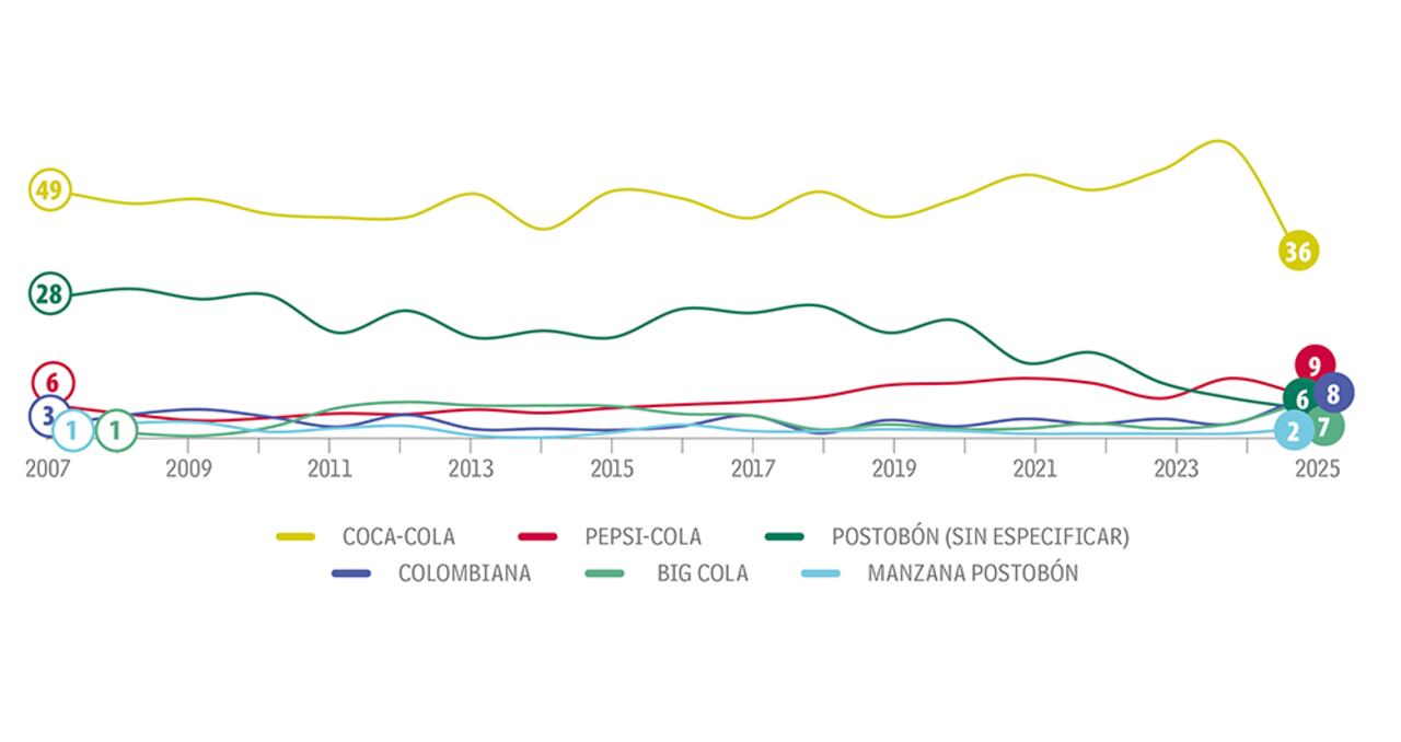 Tras obtener su mejor indicador el año pasado (58 por ciento), Coca-Cola pierde 22 puntos este año. Sin embargo, con 36 por ciento, sigue liderando el top of mind en esta categoría y se mantiene con 12 por ciento dentro de las tres primeras marcas que más recuerdan los niños y jóvenes, sin mediar categoría, después de Adidas y Nike. Pepsi-Cola pierde 3 puntos y cae al 9 por ciento, y Postobón queda con el 6 por ciento, 2 menos que en 2024.