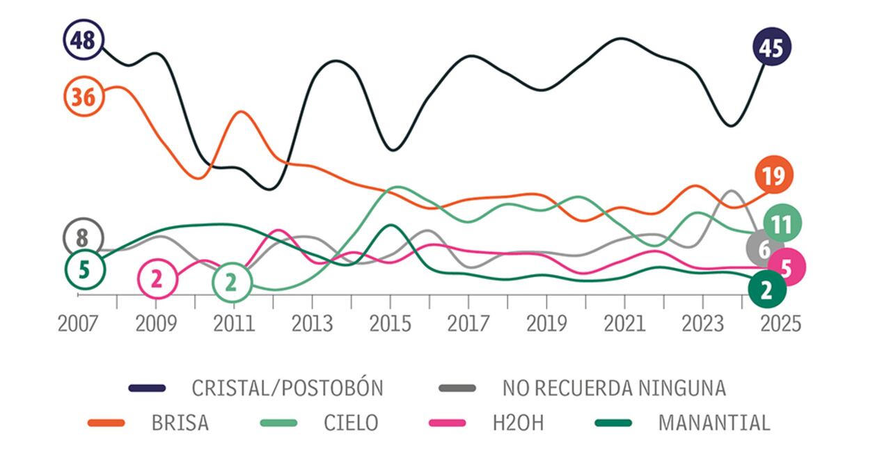 Cristal, la marca que ha liderado esta categoría, gana 14 puntos al alcanzar 45 por ciento. Brisa, que había perdido 4 puntos en 2024, gana 3 esta vez y llega a 19 por ciento en recordación; Cielo logra 11 por ciento, aunque con un punto menos frente al año pasado. El ‘no recuerda’, que había ganado 10 puntos en 2024, este año pierde 13 puntos; H2OH se mantiene en 5 por ciento y Manantial alcanza 2 por ciento, con 2 puntos menos. En Bogotá, Cristal gana 18 puntos al alcanzar 54 por ciento.