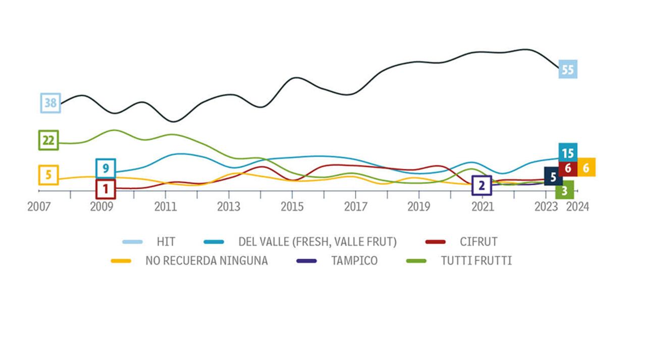 Aunque pierde 9 puntos porcentuales frente a 2023 y llega al 55 por ciento, Hit sigue firme en el liderazgo del top of mind en la categoría. Del Valle, con 15 por ciento y 2 puntos más que el año anterior, alcanza su mejor indicador de los últimos 7 años. En Medellín, Hit tiene su mayor recordación, con 66 por ciento, 4 puntos más que el año anterior. En Cali, llega a 55 por ciento, 10 puntos menos que en 2023. En Bogotá cae 12 puntos y se ubica en 52 por ciento. Del Valle tiene su mejor plaza en Bogotá, con 21 por ciento, 7 puntos más que el año anterior. En Medellín pierde 6 puntos y queda con 9 por ciento.
