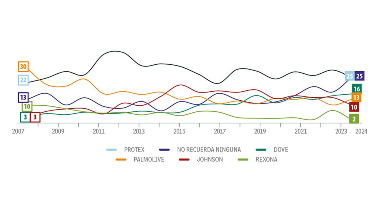 A la caída de 4 puntos porcentuales del líder Protex, que lo ubica en 25 por ciento, se suma el crecimiento de 8 puntos porcentuales del ‘no recuerda’, que alcanza ese mismo porcentaje. Mientras tanto, Dove gana un punto y queda en 16 por ciento, y Palmolive suma 3 puntos para ubicarse en 13 por ciento. En Bogotá, Protex llega a 28 por ciento, 4 puntos menos que en 2023, pero la mayor caída la registra en Barranquilla, con 18 puntos perdidos y donde queda en 14 por ciento. Dove, en Medellín, llega a 21 por ciento, 8 puntos adicionales a la medición de 2023, en tanto que el ‘no recuerda’ más alto está en Barranquilla, con 34 por ciento.