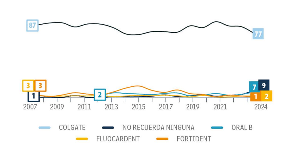 En Barranquilla, Colgate registra su top of mind más alto, con 83 por ciento, 6 puntos más que el año pasado. En Bogotá llega a 80 por ciento, pero 6 puntos menos que en 2023, mientras que en Medellín queda en 73 por ciento, 11 puntos de caída frente al año pasado.