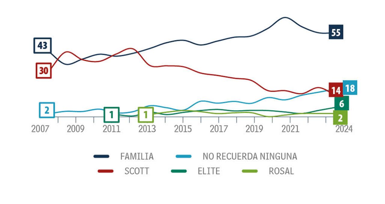 En Bogotá, Cali y Barranquilla, Scott logra 14 por ciento, pero en Bogotá y Cali pierde 5 puntos. El ‘no recuerda’ más alto está en Barranquilla, con 22 por ciento, pero en Medellín es donde más crece al aumentar 8 puntos. Entre géneros, la recordación de Familia es muy pareja: en las niñas llega a 54 por ciento, un punto más que en 2023; y en los niños, 55 por ciento, cifra que representa 2 puntos menos que el año anterior. El ‘no recuerda’ anota 22 por ciento en los niños. Familia obtiene 55 por ciento en el estrato 2, dos puntos más que el año pasado. Cae 5 puntos en los estratos de mayores ingresos. El estrato 3 es el principal para Scott, con 18 por ciento, mientras que el ‘no recuerda’ registra 20 por ciento en los estratos 2, 4, 5 y 6.