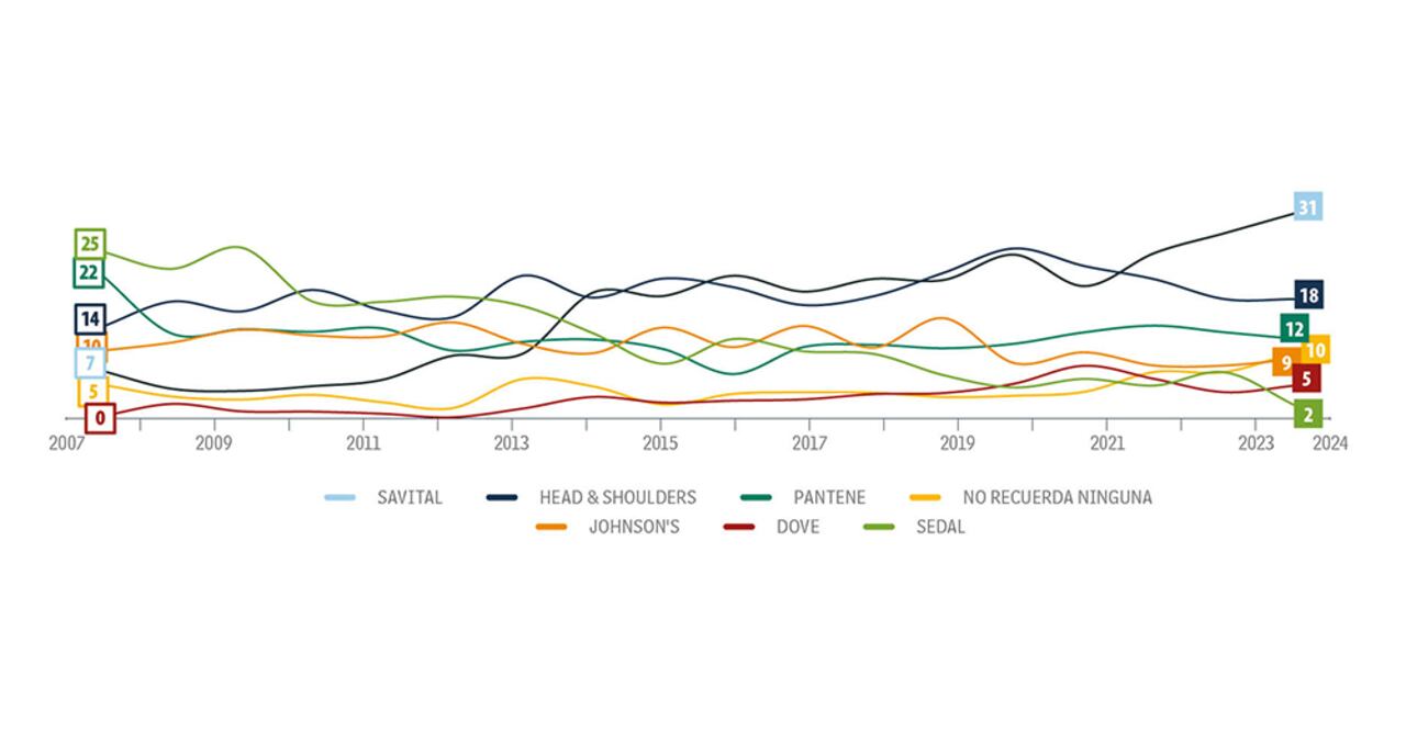 Head & Shoulders (H&S) se mantiene en 18 por ciento, mientras que Pantene pierde un punto y queda en 12 por ciento. El ‘no recuerda’ llega por primera vez a doble dígito, con 10 por ciento, y 3 puntos más que el año pasado. Por otro lado, Sedal experimenta la mayor disminución, pasando del 7 al 2 por ciento.