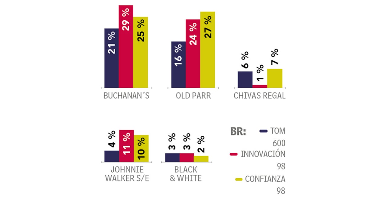 Es en Barranquilla donde gana el ‘no recuerda’, con 42 por ciento; sin embargo, es la ciudad en la que más recuerdan a Buchanan’s, con 29 por ciento, y a Old Parr, con 23 por ciento.