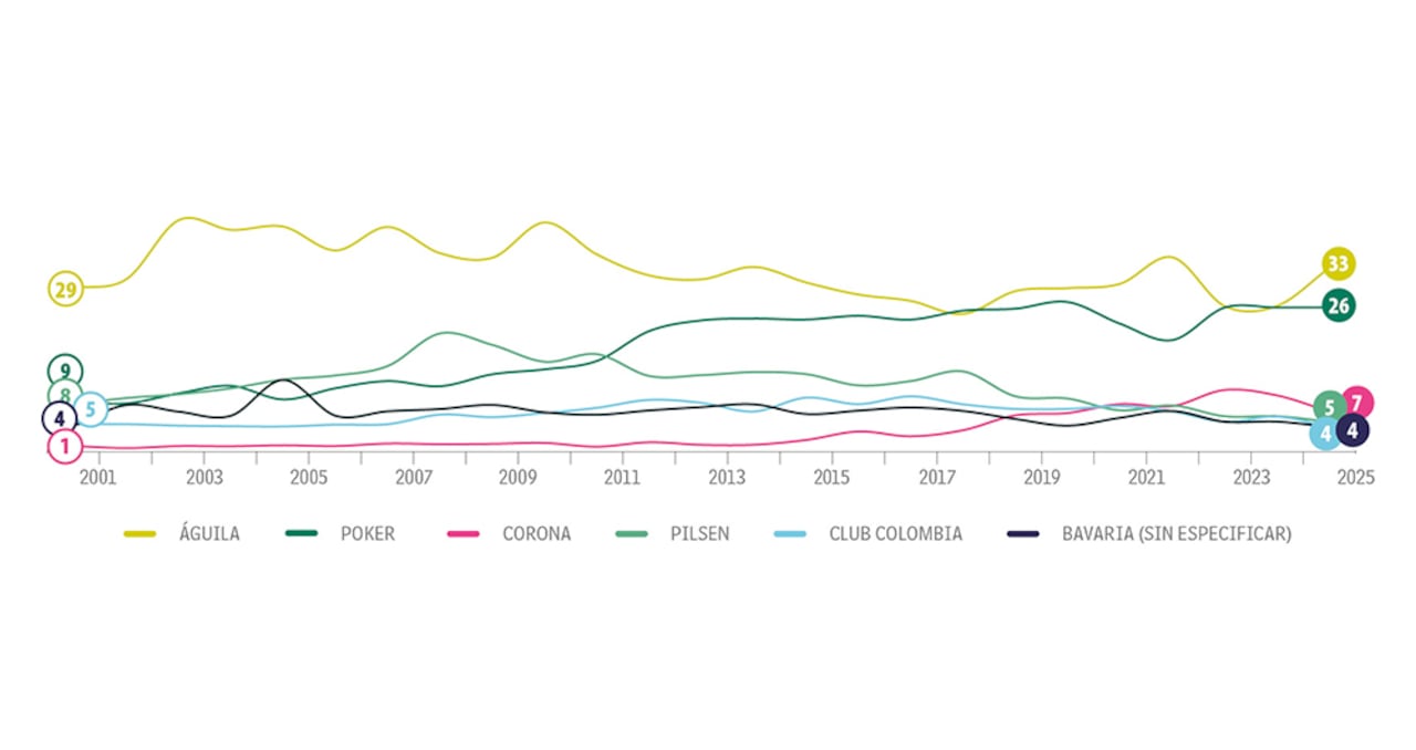 Corona, con 7 por ciento se mantuvo en el tercer lugar entre las cervezas, pero perdió 2 puntos frente a 2024. En Cali, gana Poker, con 37 por ciento, y en Medellín la primera es Pilsen, con 24 por ciento.