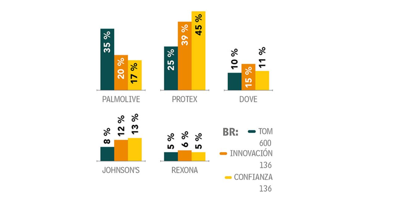 Las mujeres son las que más recuerdan a Palmolive con 37 por ciento, y también a Protex, con el 26 por ciento. Los adultos encuestados entre 35 y 49 años recuerdan en 41 por ciento a la marca líder, mientras que los de 25 y 34 años tienen presente en 34 por ciento a Protex. En innovación, Protex gana 9 puntos frente a 2022 y llega a 39 por ciento. En confianza, Protex crece 19 puntos y alcanza 45 por ciento. Palmolive se ubica en segundo lugar tanto en innovación como en confianza: 20 y 17 por ciento, respectivamente.