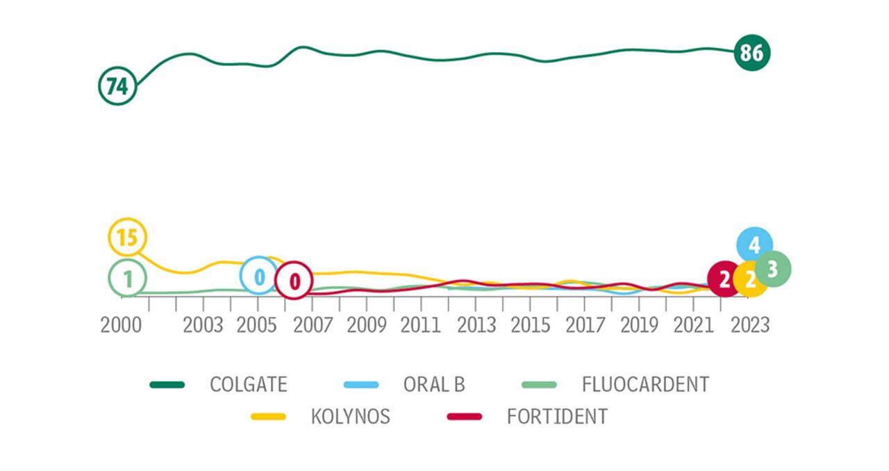 Para el caso de Oral B, entre los hombres alcanza el 6 por ciento. Los estratos 4, 5 y 6 registran el top of mind más alto de Colgate por estratos sociales con 88 por ciento, y a Oral B la recuerdan más en el estrato 3 con 6 por ciento. En cuanto a edades, el promedio es muy parejo con la recordación de Colgate; tanto los del grupo de 25 y 34 años como los de más de 50 años le dan 88 por ciento. En innovación y confianza, esta marca también arrasa con las cifras, 85 y 87 por ciento, respectivamente, obtuvo en 2023. Es decir, 4 y 2 puntos porcentuales más que en 2022. Cabe destacar que la percepción de innovación de Oral B creció de 2 a 5 por ciento frente a 2022 y en confianza los encuestados le dan un 5 por ciento.