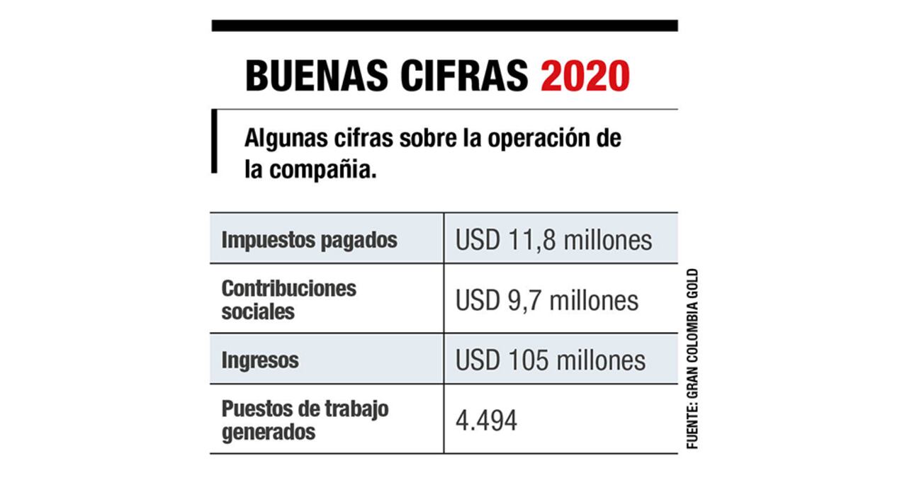 En materia de impuestos, Gran Colombia Gold le dejó al país más de 11 millones de dólares: 1,08 millones por concepto de regalías y 10,8 millones por impuestos al oro. Este año empezó con buena estrella para la minera. En el primer trimestre sus ingresos consolidados llegaron a los 101,9 millones de dólares. Además, hace pocos días se conoció la compra de la compañía Gold X.