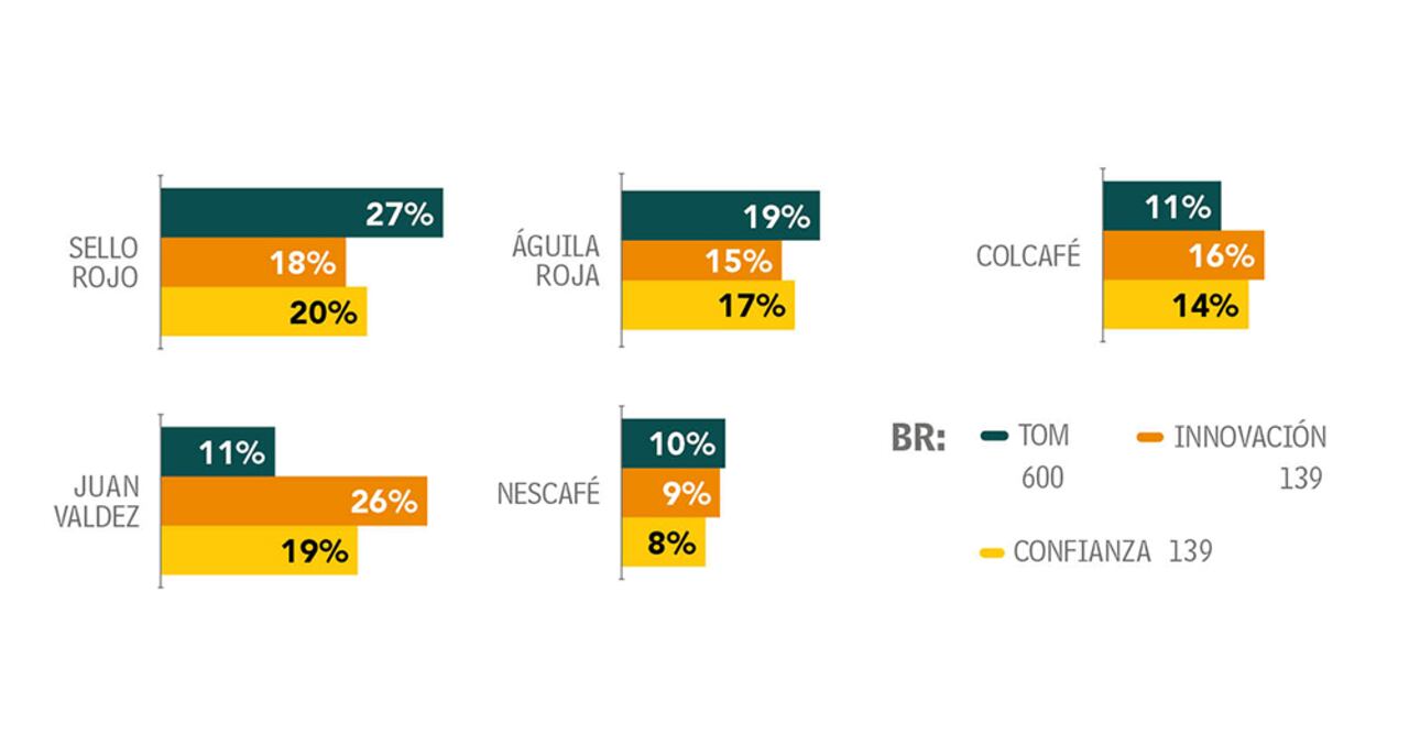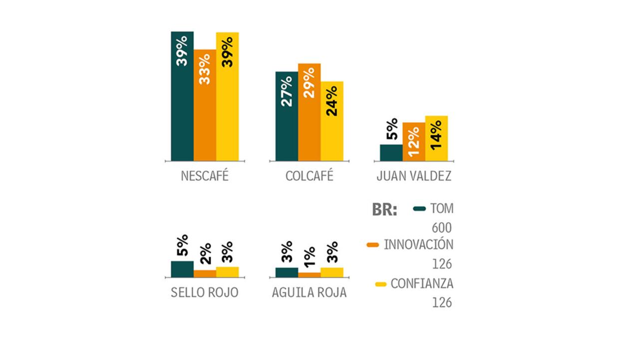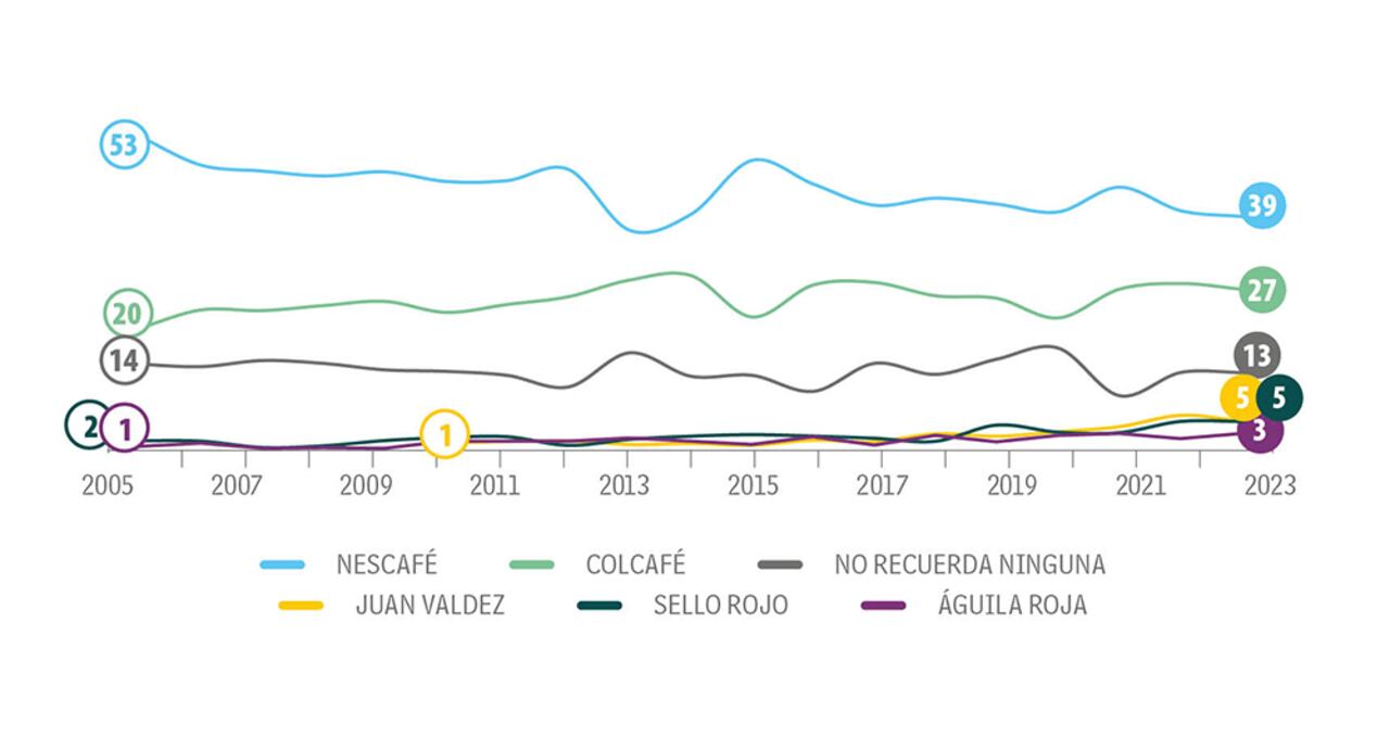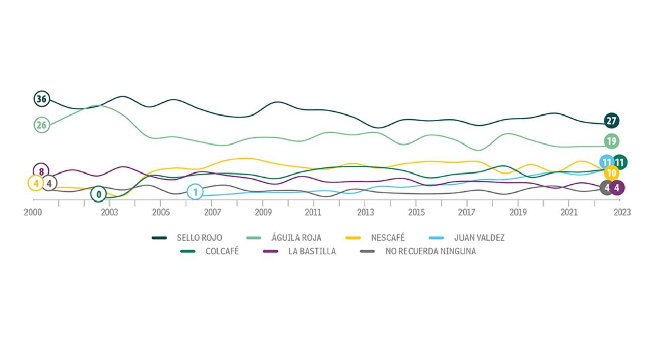 Sello Rojo mantiene el primer lugar en esta categoría, con 27 por ciento. Le sigue Águila Roja que conserva el 19 por ciento registrado desde el 2021. El tercer lugar se lo disputan, con 11 por ciento Colcafé y Juan Valdez, y para este año Nescafé bajó 4 puntos y registra 10 por ciento.