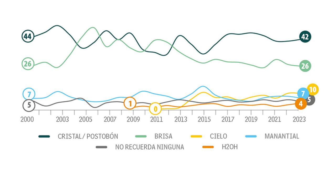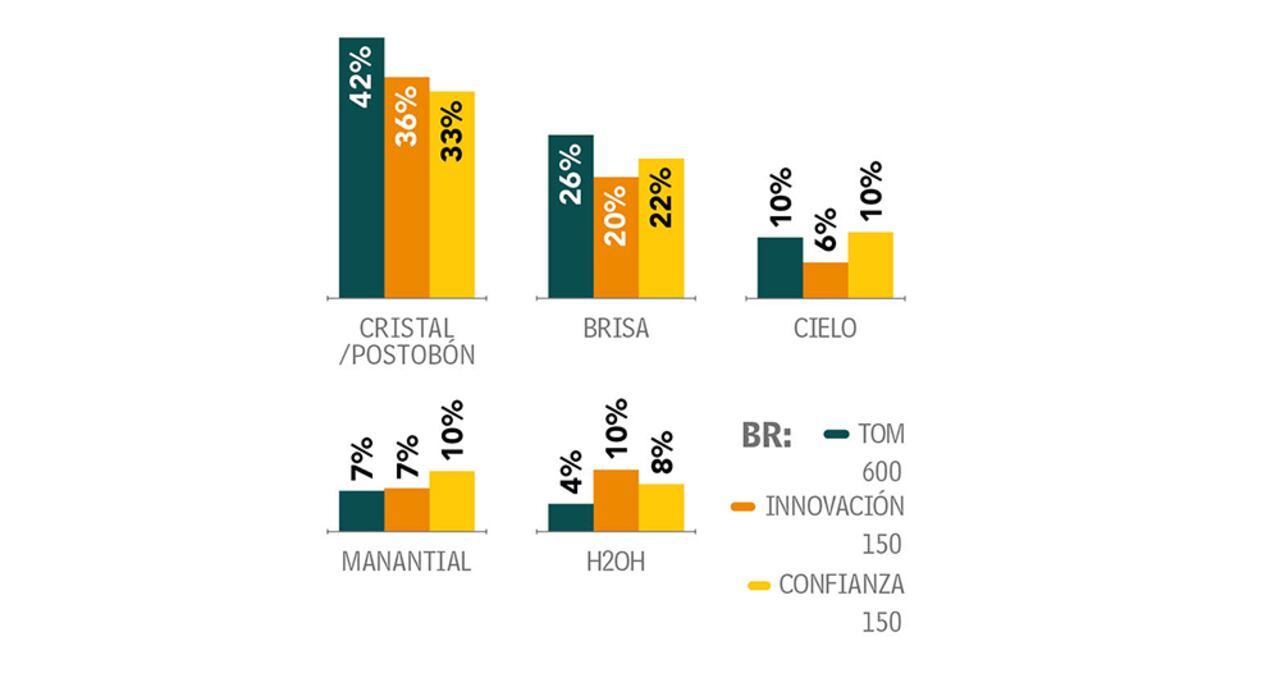 Cristal conserva el primer lugar de recordación de marcas en esta categoría con 42 por ciento. Brisa, aunque pierde un punto porcentual frente al año anterior conserva el segundo puesto con 26 por ciento, y en tercer lugar se mantiene Cielo con el mismo 10 por ciento del año pasado, superando a Manantial, que obtuvo 7 por ciento. Es en Cali donde más recuerdan a Cristal, con 45 por ciento, luego Bogotá, con 43 por ciento, y Barranquilla, con 42 por ciento. La ciudad donde alcanza mayor recordación Brisa es Barranquilla, con 37 por ciento, mientras que para Cielo es Bogotá, con 11 por ciento.