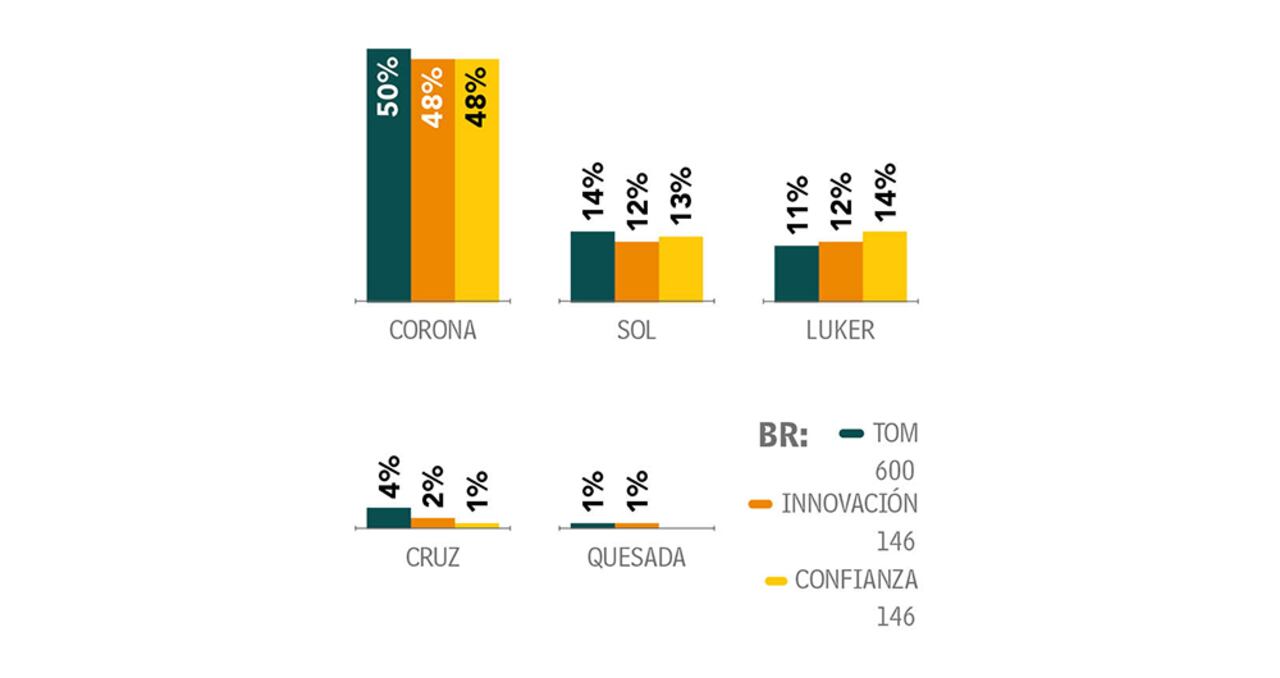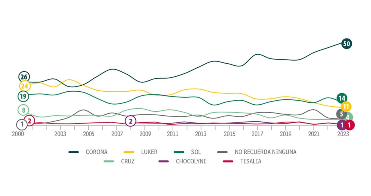 Desde 2021, Corona viene rompiendo su propio récord de recordación. Este año, una vez más, alcanza su top of mind más alto en la historia de la medición, con 50 por ciento, 3 puntos porcentuales más que en 2022. El segundo lugar lo ocupa Sol, con 14 por ciento, tres puntos menos que el año pasado, y Luker alcanza 11 por ciento, tras una tendencia a la baja desde 2018.
