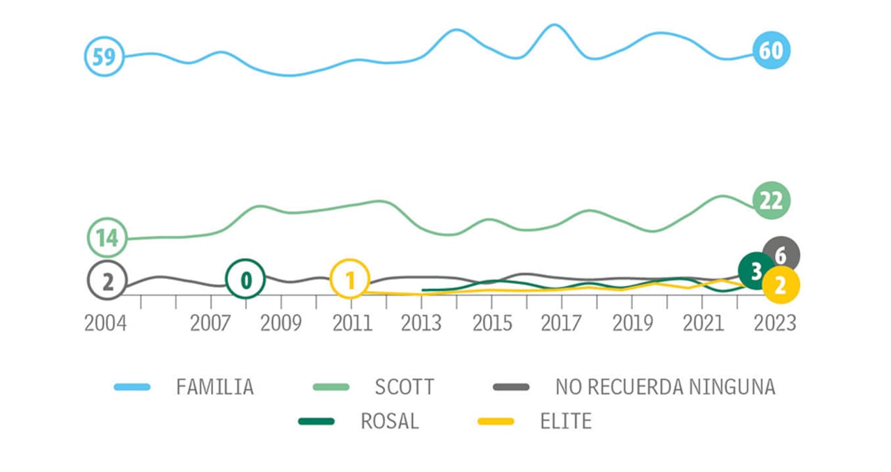 Aunque su liderazgo en el top of mind de la categoría es consolidado, Familia rompe la tendencia descendente que traía en los dos últimos años y gana 1 punto porcentual, llegando al 60 por ciento de recordación. Scott, en segundo lugar, pierde 3 puntos frente al año pasado y queda en 22 por ciento, mientras el ‘no recuerda’, con 6 por ciento, gana 2 puntos. Es en Barranquilla donde Familia suma 13 puntos, para un nivel de recordación este año de 66 por ciento. En Medellín, esta marca también crece 6 puntos porcentuales, para ser recordada en 65 por ciento. Es en Cali donde más recuerdan a Scott, con 29 por ciento. Por género, a Familia la recuerdan más los hombres, con 66 por ciento, mientras que Scott tiene un mayor top of mind en mujeres, con 26 por ciento. En los estratos 4, 5 y 6, Familia llega a 74 por ciento, mientras que Scott registra 27 por ciento en el estrato 3. Entre los encuestados de 35 y 49 años, Familia alcanza el 68 por ciento, y los más jóvenes (18 a 24 años) recuerdan con 36 por ciento a Scott. La marca más innovadora de papel higiénico en Colombia es Familia, con 66 por ciento, 4 puntos más frente al año pasado. Scott mantuvo el mismo porcentaje del año pasado: 17 por ciento. En confianza, Familia también sigue creciendo, gana 5 puntos porcentuales frente a 2022 y registra 65 por ciento.