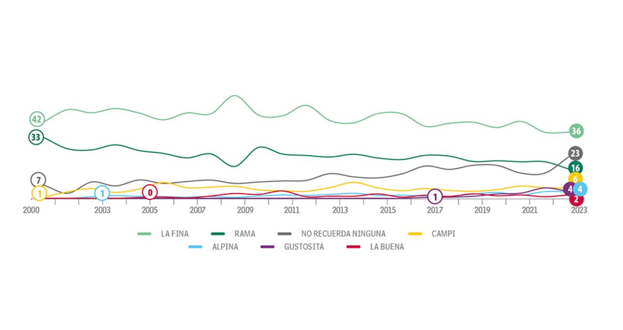 La Fina mantiene su liderazgo en el top of mind de esta categoría con 36 por ciento, la misma cifra obtenida el año pasado. La que sí crece en 9 puntos es el ‘no recuerda’, que llega a 23 por ciento. Rama pierde 4 puntos y alcanza 16 por ciento en 2023. Es en Bogotá donde La Fina es ‘la preferida’, con 49 por ciento, 4 puntos más que el año pasado. Rama es Rama en Medellín, con 29 por ciento, y es en Cali donde gana el ‘no recuerda’, con 37 por ciento. El 40 por ciento de las mujeres no olvida a La Fina, y Rama alcanza 19 por ciento entre los hombres. Con 40 por ciento, en el estrato 2, La Fina alcanza su recordación más alta por estratos, y es en los estratos 4, 5 y 6 en los que es más recordada Rama, con 25 por ciento. Con 50 por ciento, es más recordada La Fina entre los consultados de más de 50 años. Entre los de 35 a 49 años, Rama registra 23 por ciento de top of mind. La Fina es considerada la marca más innovadora, con 24 por ciento, aunque cayó 4 puntos frente al año pasado. Y la gran perdedora fue Rama, que pasó de 32 a 21 por ciento. Campi, que ocupa el tercer lugar en innovación, dio el salto más alto, al escalar de 7 a 15 por ciento. En confianza, La Fina también lidera, con 32 por ciento, 6 puntos más que el año pasado; Rama pierde 12 puntos y queda en 21 por ciento, mientras que Campi gana 8 puntos y llega a 12 por ciento.