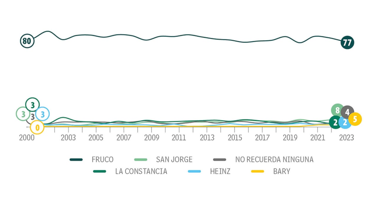 En esta categoría, Fruco, pese a que perdió 3 puntos frente a 2022, lleva la supremacía en el top of mind, con 77 por ciento de recordación, y con una diferencia de 69 puntos al segundo lugar, San Jorge, que este año gana 2 puntos al llegar a 8 por ciento. Es Bary, con 3 puntos más, la que marca una diferencia en la medición, al alcanzar 5 por ciento. Cali es la ciudad que pone el sabor de la recordación a Fruco con 84 por ciento, 6 puntos porcentuales más que el año anterior; y es en Barranquilla donde más se recuerda a San Jorge, con 12 por ciento. Los hombres, con 79 por ciento, tienen en mente a la marca líder de las salsas de tomate. Es en los estratos 2 y 3 donde más recuerdan a Fruco, con 78 por ciento, y son los consultados entre 35 y 49 años aquellos que tienen el mayor top of mind (79 por ciento) de Fruco. La marca más innovadora sigue siendo Fruco, con 71 por ciento. Le siguen Bary, con 10 por ciento, y la Constancia, con 4 por ciento. Pese a que bajó 3 puntos, Fruco también es percibida como la marca en la que más confían, con 78 por ciento. Bary gana 6 puntos al llegar a 7 por ciento.